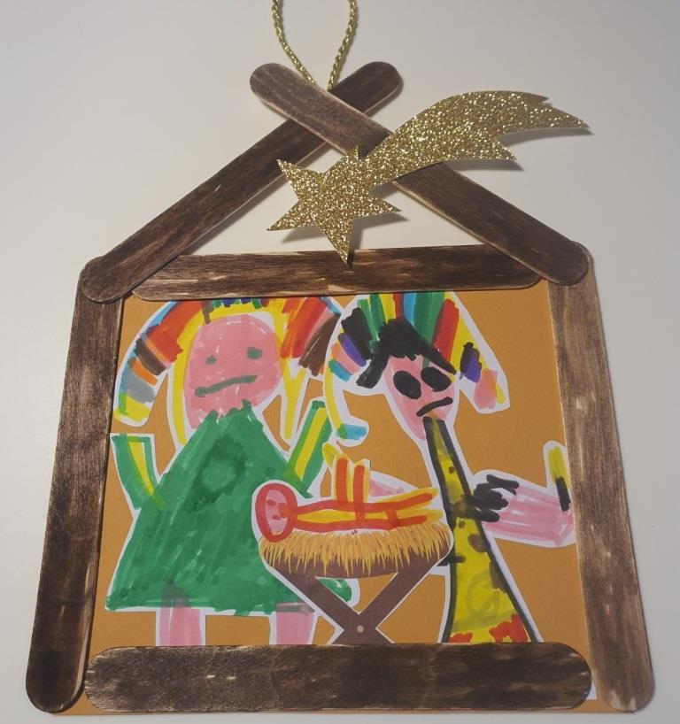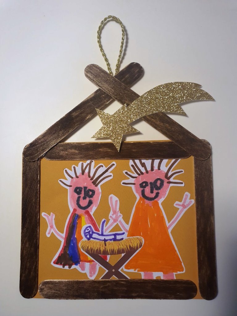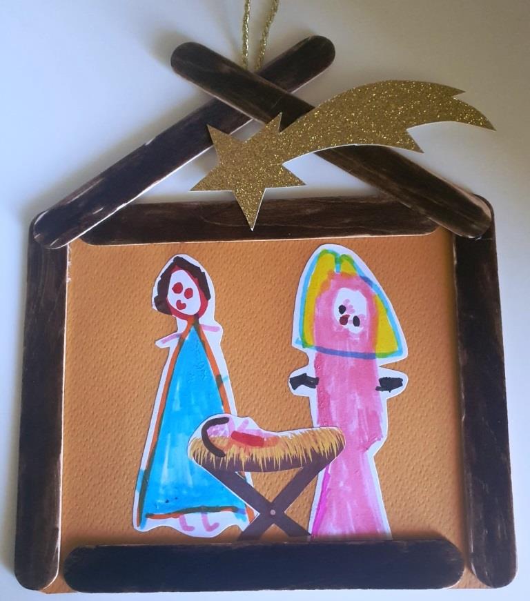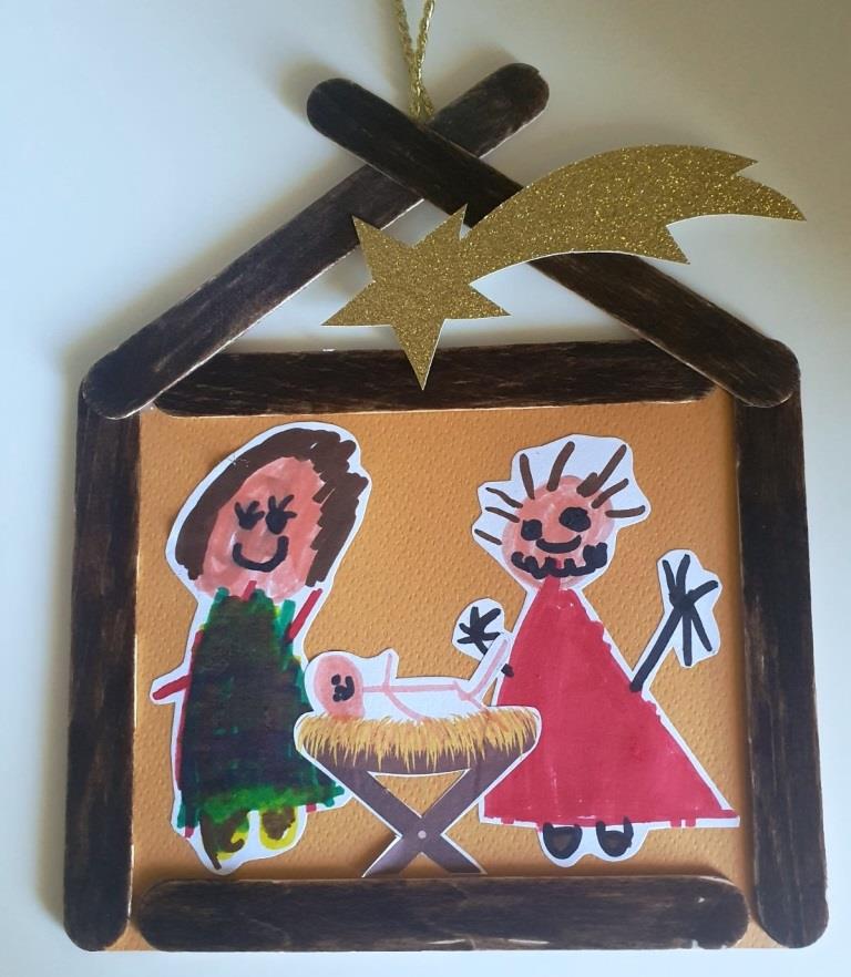 Τα παιδιά ζωγραφίζουν σε απλό χαρτί την Παναγία, τον Ιωσήφ και τον μικρό Χριστό στη φάτνη. Κόβουμε τα στοιχεία της ζωγραφικής και τα κολλάμε σε χαρτονάκι. Ζωγραφίζουν τα γλωσσοπίεστρα με μαρκαδόρο.